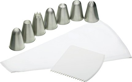 Neun Stück Eis für die Dekoration von Kuchen, Keksen und Gebäck mit Puderzucker oder Sahne setzen. Inklusive einer abwaschbaren Kunststoff ausgekleidet Spritzbeutel, sieben Düsen aus Edelstahl und eine Glasur verteilt Kamm. Einfach zu verwenden, wählen Sie einfach die Düse und am Ende des Spritzbeutel.