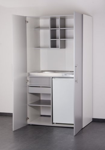 Mebasa MK0011S Schrankküche, Miniküche, Single Küche in Silber/Grau mit weißem Korpus 100 cm mit Kühlschrank, Spüle und Glaskeramikkochfeld